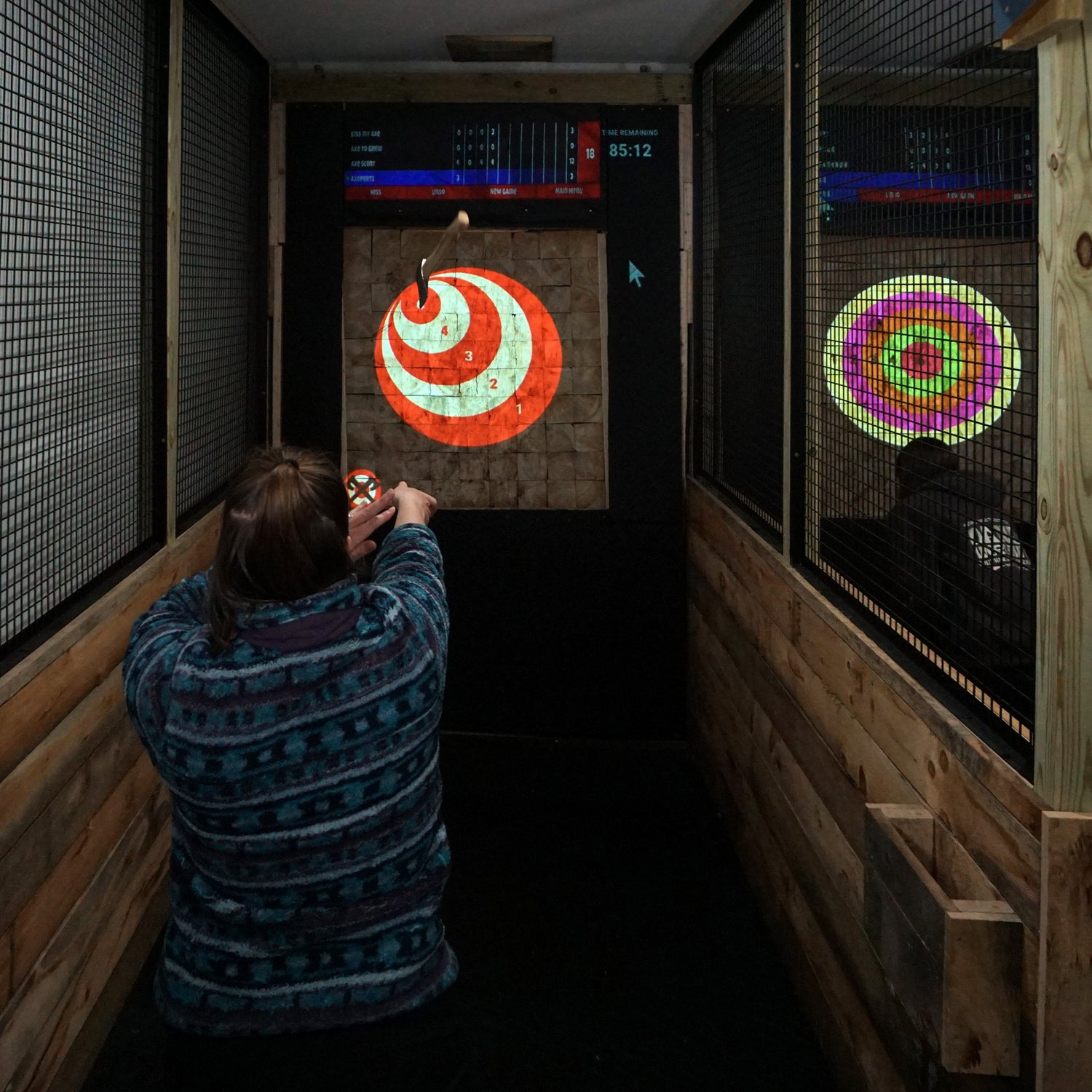 Reserve a lane today and axe throw with up to 6 people at a variety of games and targets. If you're into competing with friends, or looking to have some fun with good people while learning a new activity—axe throwing is just the thing!